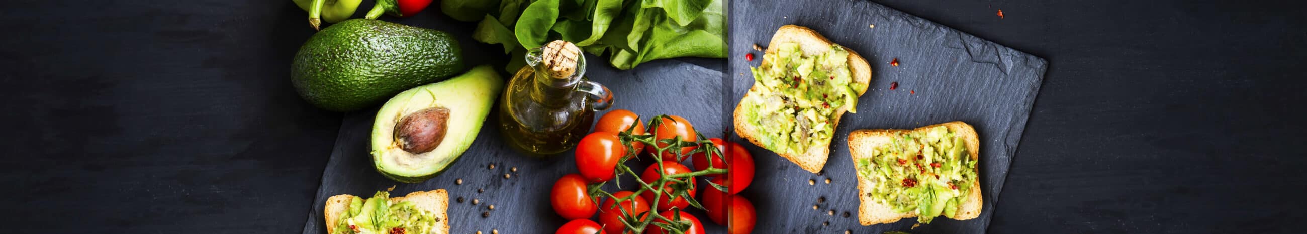 Fresh avocado on toast with chili flakes spice, cherry tomatoes, salad, pepper and avocado, overhead shot