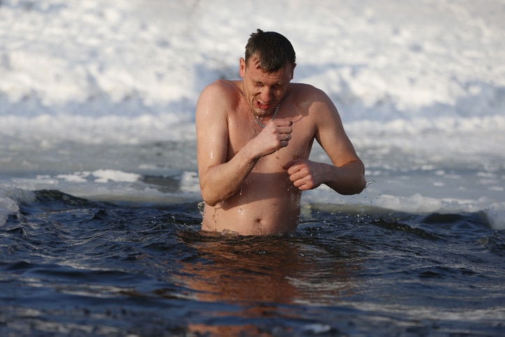 A man is plunged into an ice-hole.Bathing in ice water. The Baptism of Jesus. Religious holiday - Dr. Bronner's