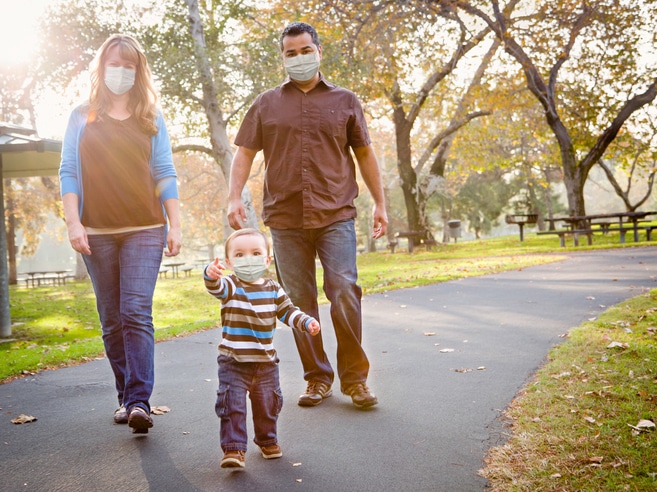 Happy Mixed Race Ethnic Family Walking In The Park Wearing Medical Face Mask - Dr. Bronner's