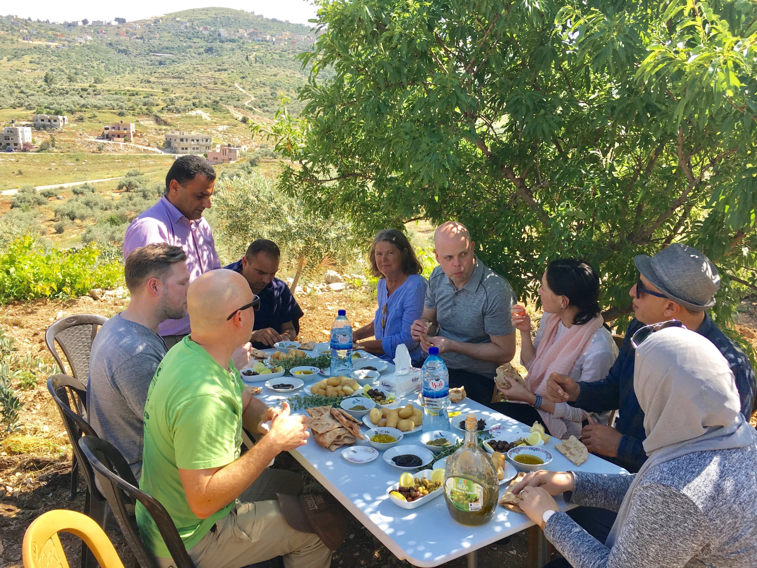 The author take a lunch break in Palestine with Nasser of Canaan Fair Trade and Palestinian olive farmers