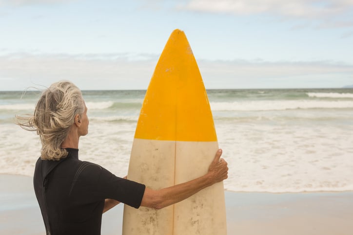 Rear view of woman carrying surfboard while standing against shore
