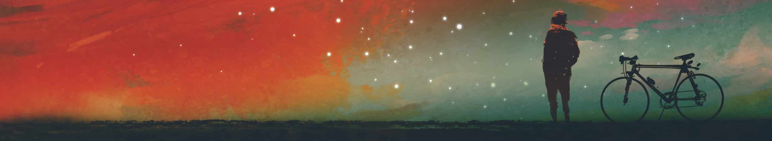 man with bicycle standing against red clouds in the sky - Dr. Bronner's