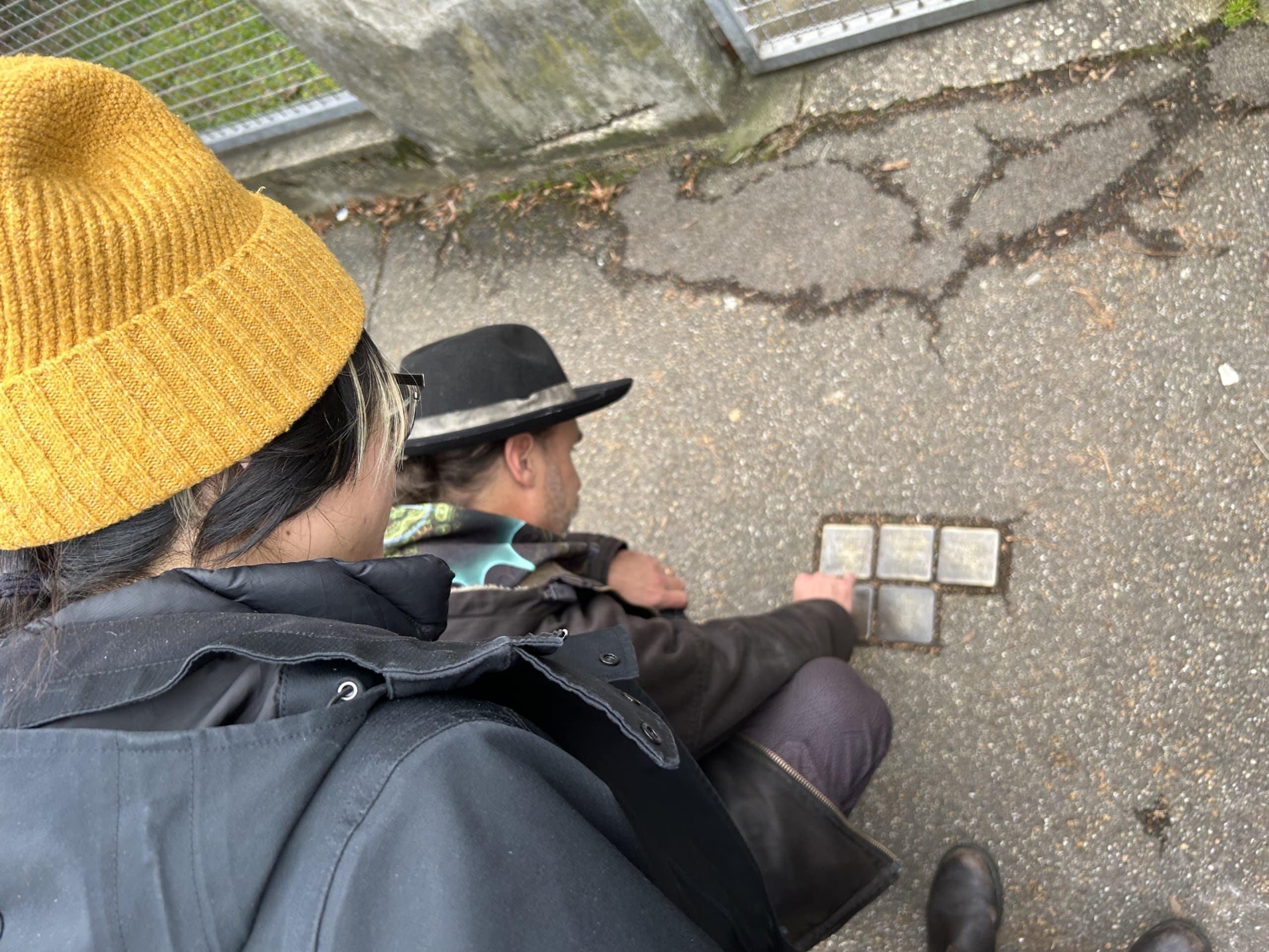 David and Maya looking at stumblestones