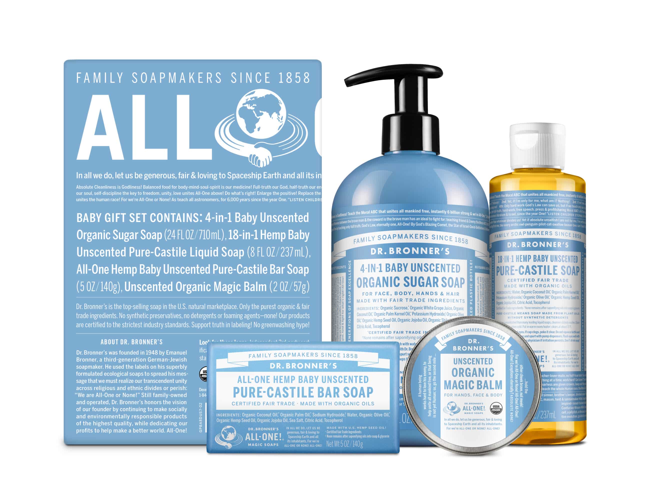 Image of baby-unscented products including sugar soap, bar soap, pure-castle liquid soap and body balm
